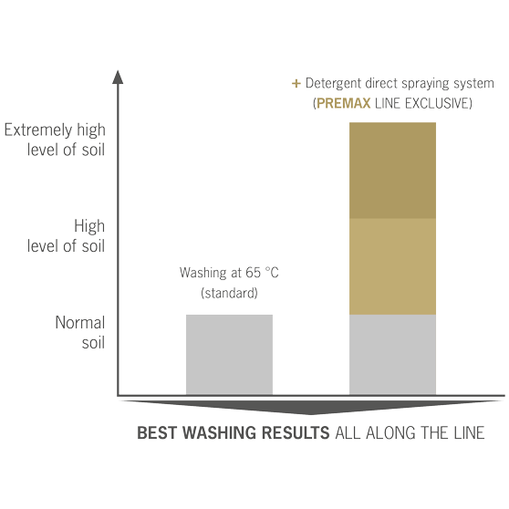 PREMAX utensil washers therefore spray the concentrated detergent solution directly onto the utensils. This liquid solution attacks the residual dirt before it is washed off by steam washing.