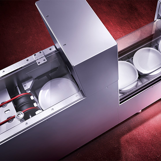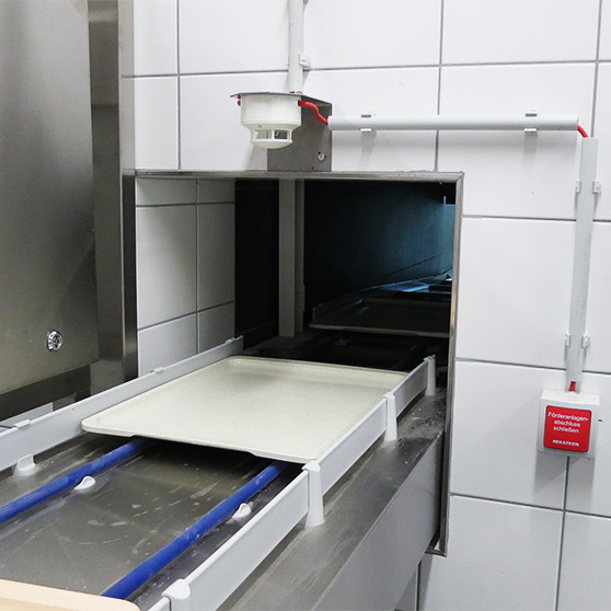 The round-belt conveyors that are used for conveying the trays frequently run through fire protection sections. In such a case, special conveyor system closures are required that, for example, can seal off the dining room from the scullery in the event of a fire, thus preventing the fire from spreading.