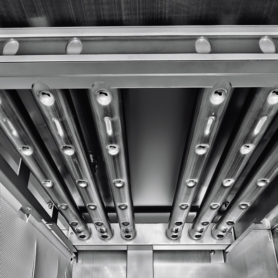 During the washing operation, an even distribution of the wash water is essential to achieve a perfect cleaning result. For the wash jets to be most effective, they were given a special shape by HOBART so that compared to conventional systems, they cover a larger area in a more accurate manner.
