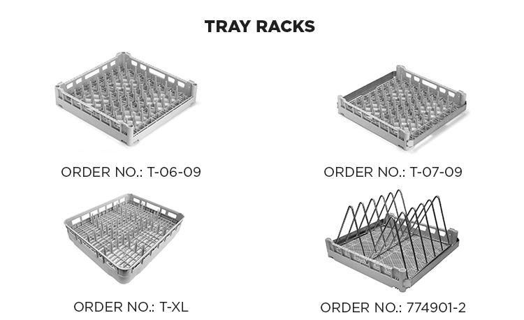 | T-07-09 | Tray rack 500 x 500 mm for 9 GN-trays, open on two sides with stainless steal guide (also suitable for hood-type dishwashers in corner operation) |